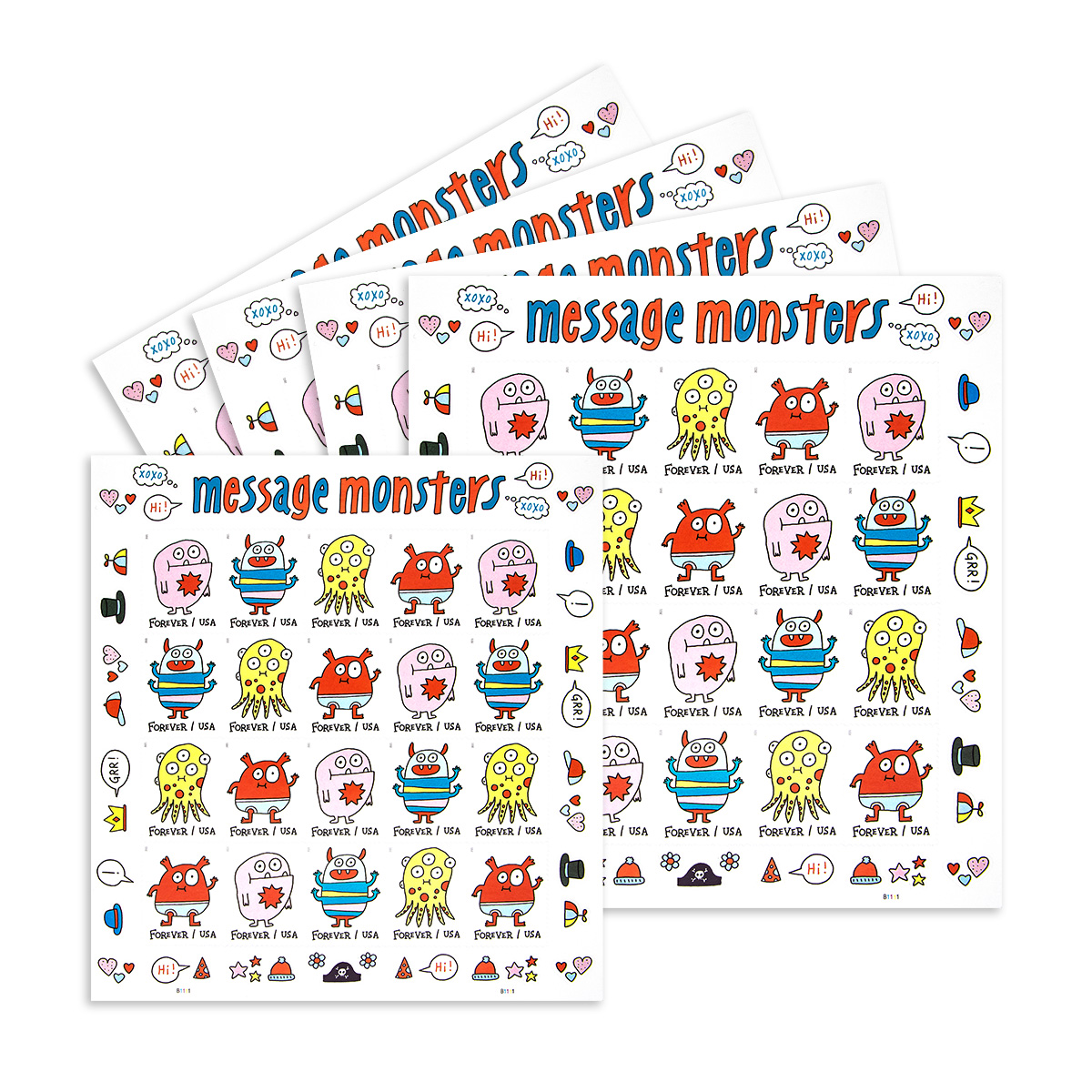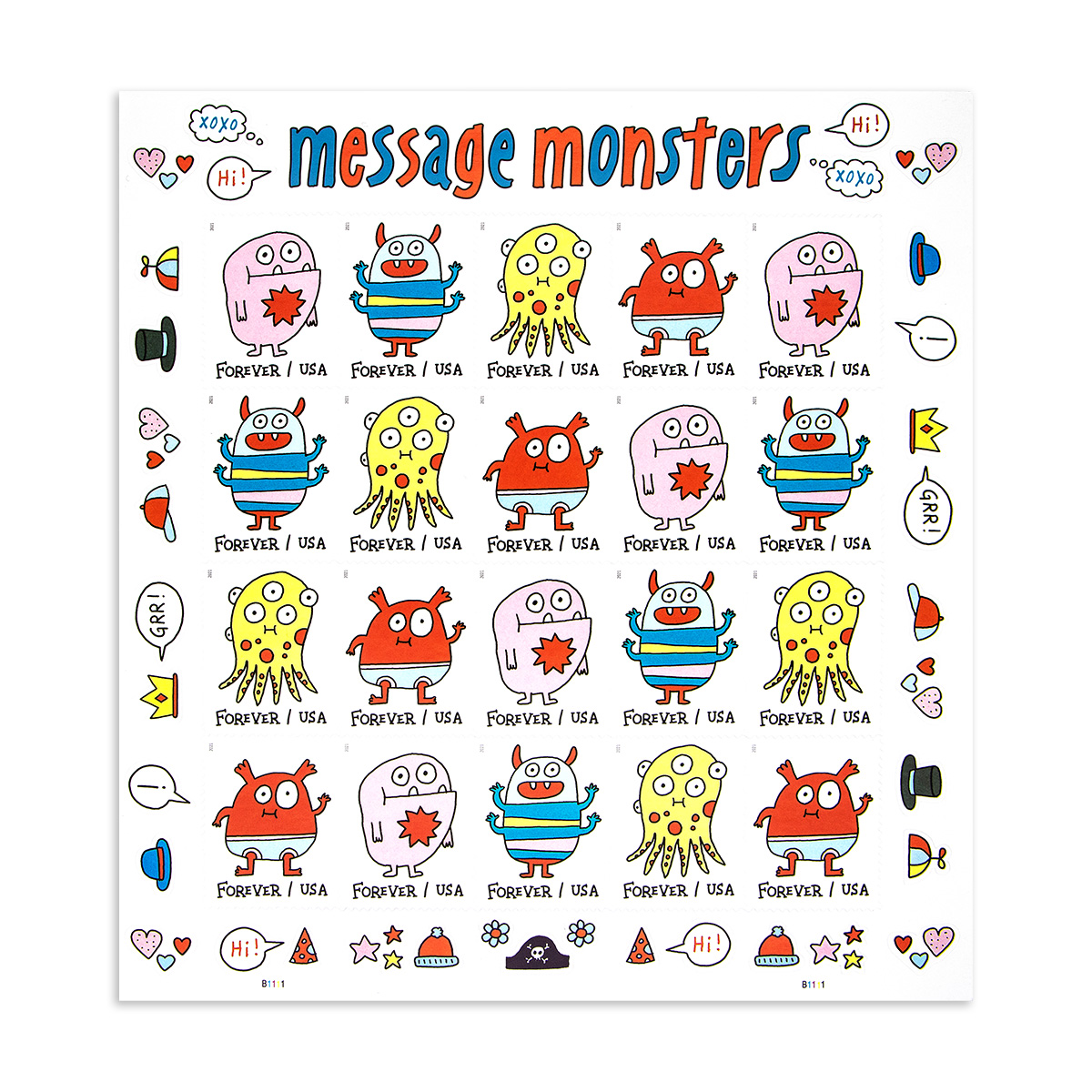 When the USPS created a set of Message Monsters stamps in 2021, many speculated it was to attract younger people to the world of stamps. In addition to picturing four different monsters, the panes of 20 also included accessory stickers to decorate the stamps with. These included hearts, hats, voice balloons, flowers, and more.